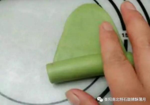 9.將油酥卷的兩頭向內壓,按扁搟成圓型