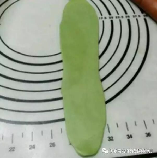 5.將油酥皮的收口朝上,搟成牛舌狀,盡量將油酥皮搟開(kāi)